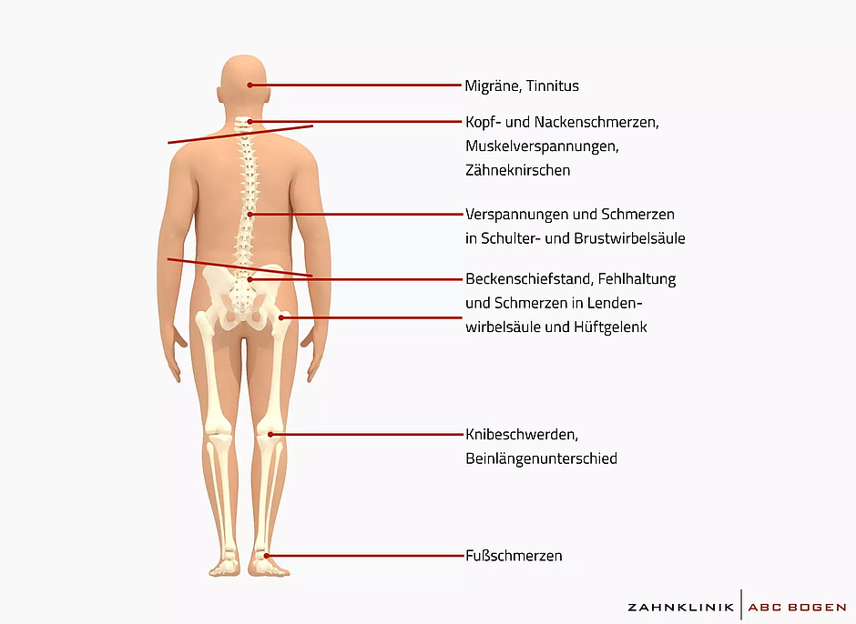 Die Symptome einer CMD können vielfältig sein. Die Folgen dieser Überlastung der Kiefergelenke reichen von Knackgeräuschen beim Essen und Sprechen über Kiefer-, Nacken- und/oder Rückenschmerzen bis hin zu Ohrgeräuschen, Schwindel, Migräne und Beschwerden am Knie.