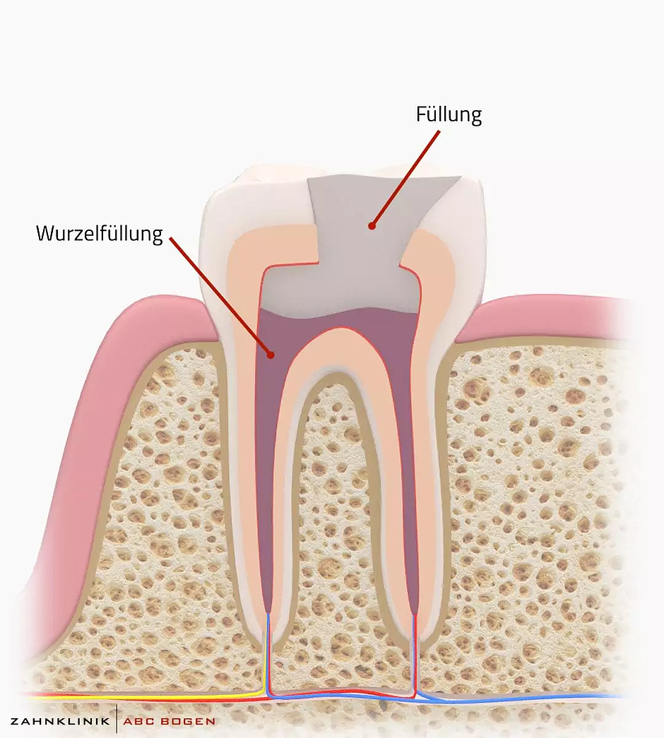 Während der Wurzelkanalbehandlung wird das bakteriell infizierte Zahnmark entfernt und das Kanalsystem im Zahnnerv desinfiziert. Das Kanalsystem wird anschließend mit einem zahnärztlichen Füllmaterial geschlossen. Die Dauer der Behandlung beläuft sich auf ein bis zwei Sitzungen. Schmerzen während des Eingriffs werden durch eine schonende örtliche Betäubung in aller Regel vollständig vermieden.