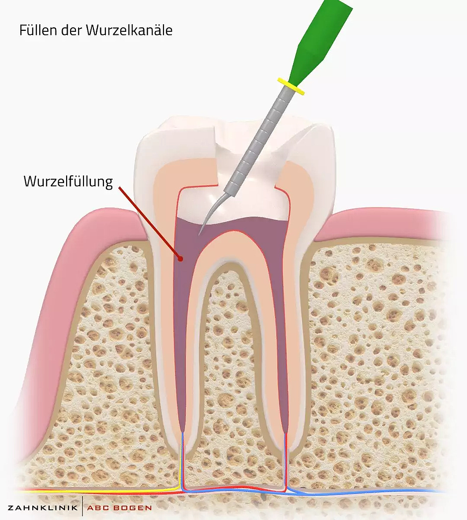 Nachdem bei sämtlichen Wurzelkanälen das Auffinden der feinen Kanäle, die Säuberung und Desinfektion sorgfältig ausgeführt und beendet wurden, wird das Kanalsystem mit einem speziellen Füllmaterial versiegelt.