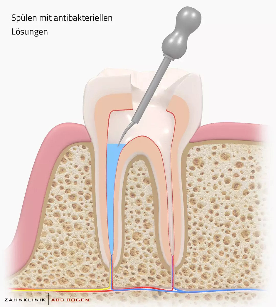 Das Innere des Zahns muss nun vermittels kleiner, spezieller Feilen vorsichtig geleert werden. Die hauchfeinen Wurzelkanäle werden dabei leicht erweitert. Dieser Schritt dient dazu, das Zahninnere von Bakterien zu befreien. Das Kanalsystem der Zahnwurzel wird dabei durch wiederholtes Ausspülen mit einem desinfizierenden Mittel von den für die Entzündung verantwortlichen Erregern gereinigt.