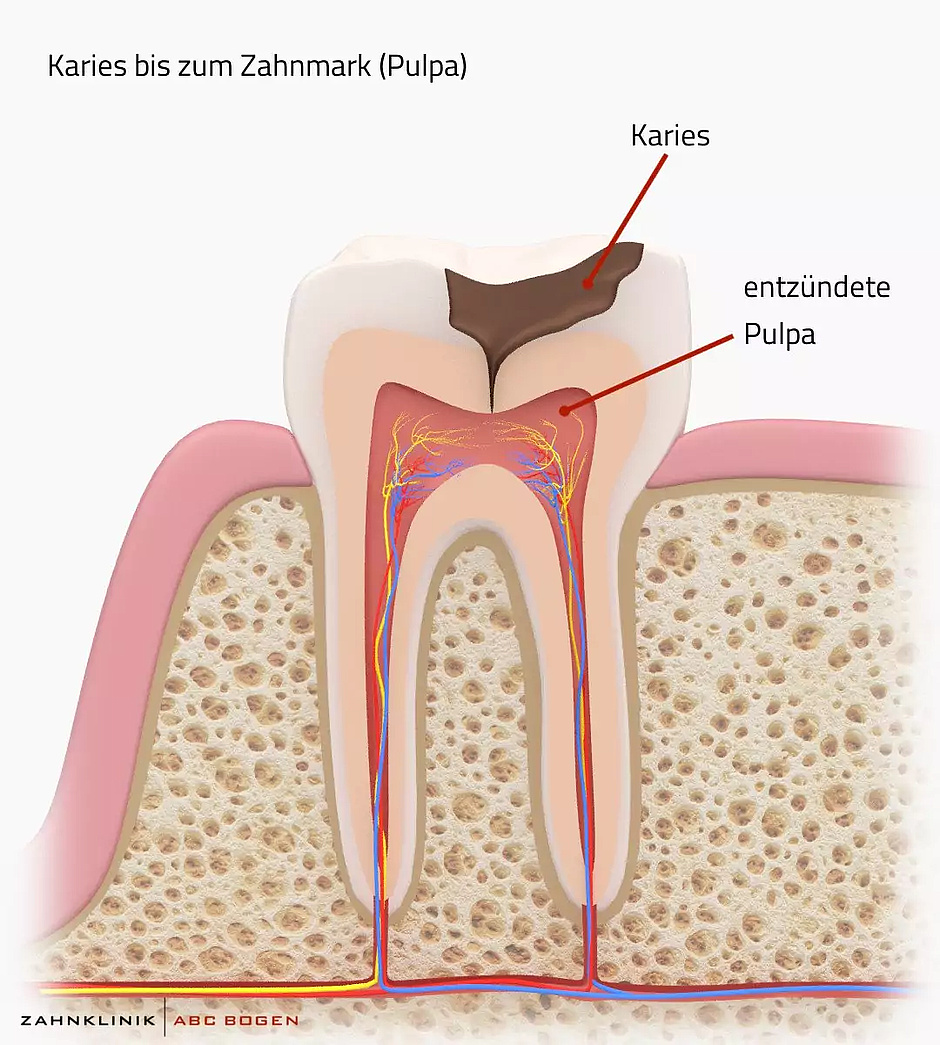 Der Zahnnerv, auch Pulpa genannt, setzt sich insbesondere aus Blutgefäßen und Nervenfasern zusammen. Bakterielle Infektionen der Pulpa können Entzündungen und damit auch starke Schmerzen verursachen. Ein Absterben des Nervengewebes kann ebenfalls die Folge sein. Wenn der Zahn abgestorben ist, spüren Sie zwar keine Schmerzen (mehr), die Behandlung ist jedoch auch in diesem Fall unbedingt notwendig.