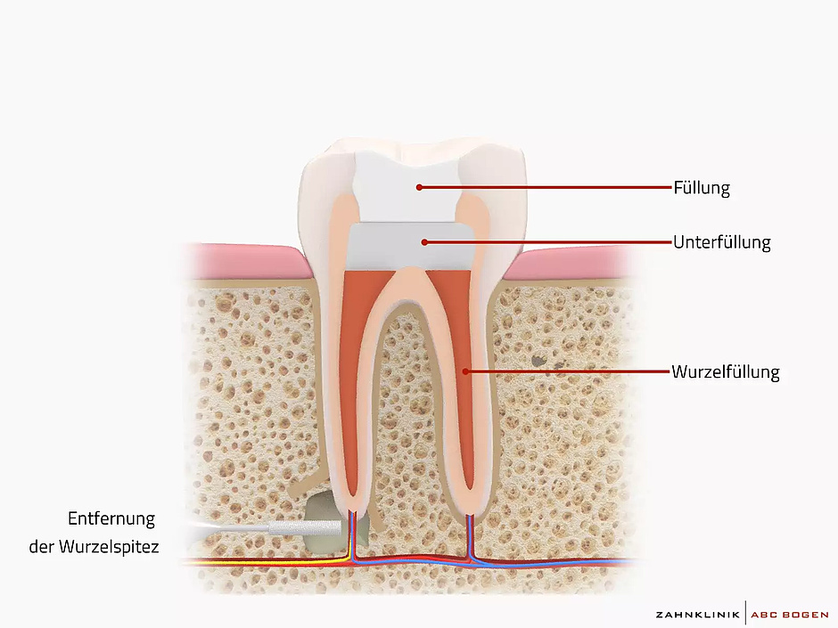 In der Regel wird die Spitze der Wurzel um ungefähr drei Millimeter gekürzt. In Ausnahmefällen muss diese noch stärker verringert werden, beispielsweise bei einer erheblichen Krümmung der Wurzel oder wenn bei einer vorausgegangenen Wurzelkanalbehandlung ein hauchfeines Instrument im Wurzelkanal unbemerkt abgebrochen und verblieben ist.