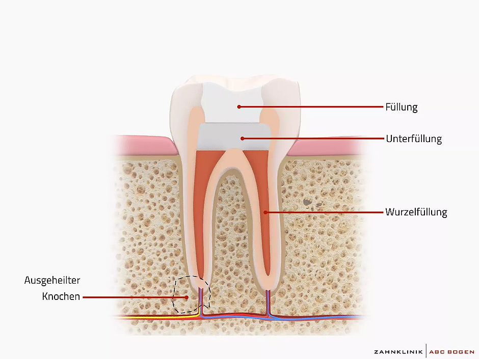 Die Wundheilung im Weichgewebe des Zahninnern nach erfolgter Wurzelresektion dauert in der Regel sieben bis zehn Tage, danach werden die Nähte wieder gezogen. Nach ungefähr drei Monaten bis zu einem halben Jahr werden Sie erneut in die Praxis gebeten, um den Heilungsprozess im Bereich des Knochens mithilfe von Röntgenbildern zu kontrollieren. Diese Kontrolluntersuchung überprüft auch zuverlässig den Erfolg der Wurzelspitzenresektion.