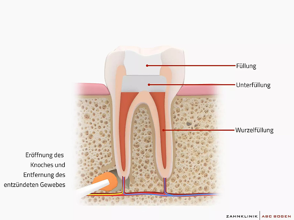 Weiterhin werden das Zahnfleisch und die Knochenhaut des geschädigten Zahns bei dem operativen Eingriff durchtrennt, um an die Wurzelspitze zu gelangen. Diese liegt unter dem Kieferknochen, der so weit abgetragen wird, bis das Zahninnere sichtbar ist. So werden die Voraussetzungen für den folgenden Therapieschritt geschaffen, in welchem das entzündete Gewebe um die Wurzel entfernt wird.