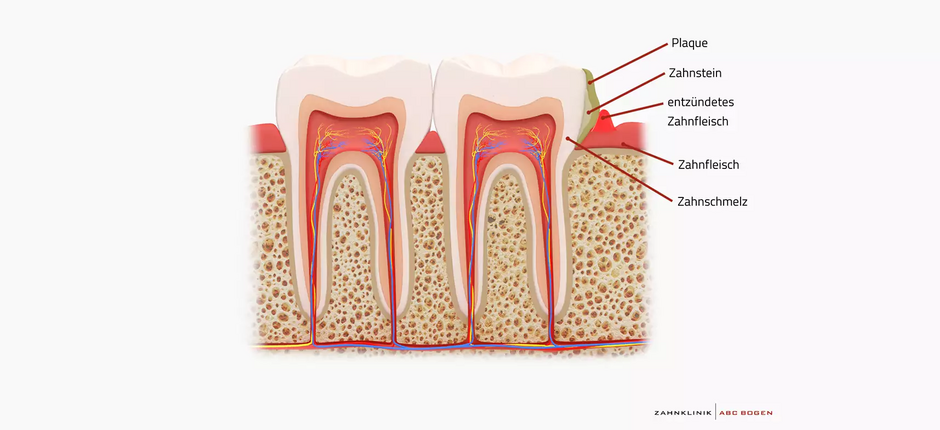 Besteht Plaque über einen längeren Zeitraum auf der Zahnoberfläche, wird diese durch sich im Speichel befindlichen Mineralien mineralisiert. Zahnstein entsteht. Er ist also eine Folge der Plaque.