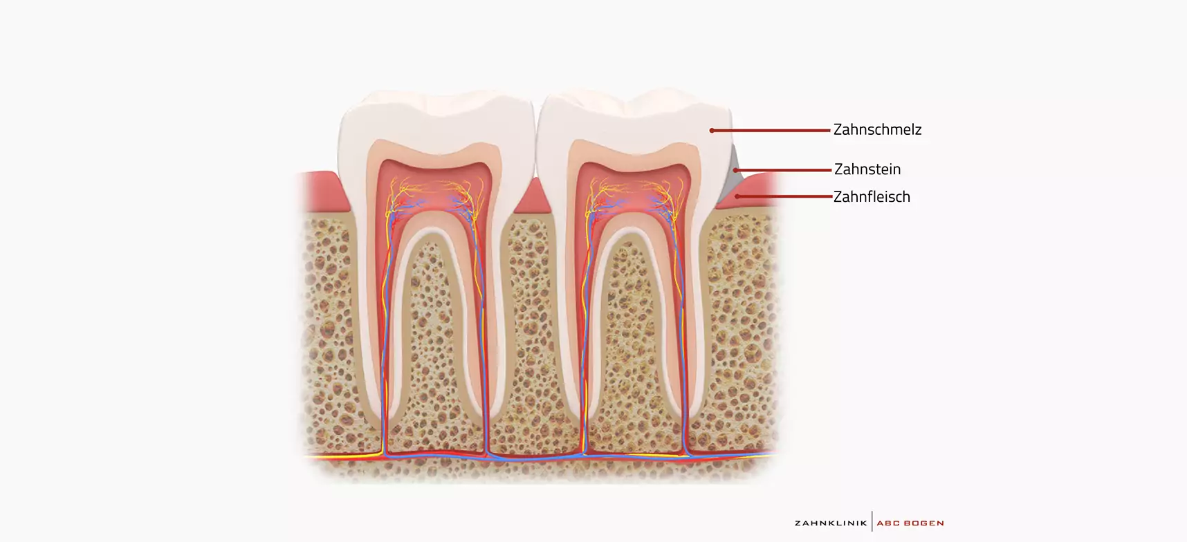 Wird Zahnstein nicht regelmäßig entfernt, wandert er mit der Zeit unbemerkt am Zahn entlang bis unter das Zahnfleisch und sorgt dort für Entzündungen.