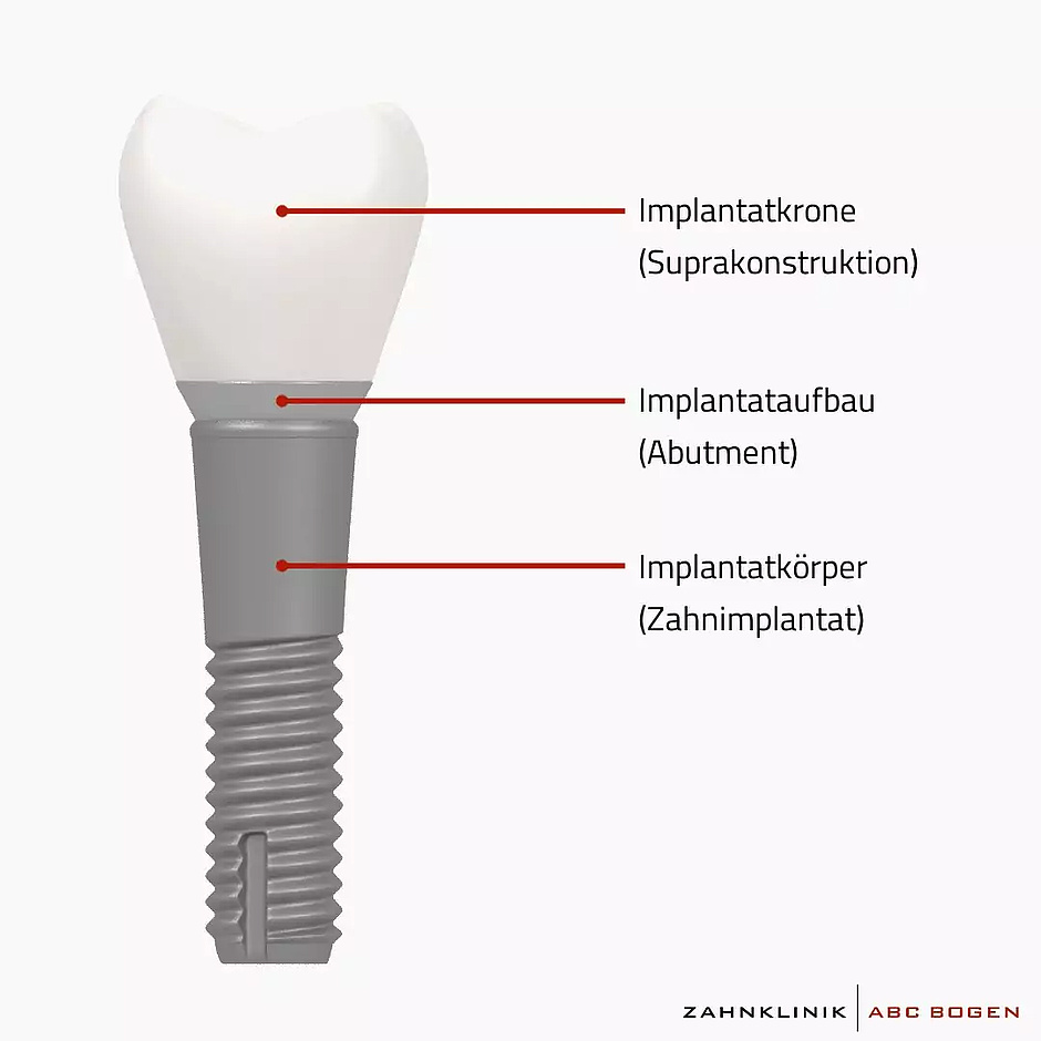 Bei Zahnimplantaten kann der Implantatkörper aus Titan oder aus auch Keramik gefertigt werden, im Falle von Vollkeramik-Implantaten besteht sowohl die Krone als auch das Implantat aus Keramik.