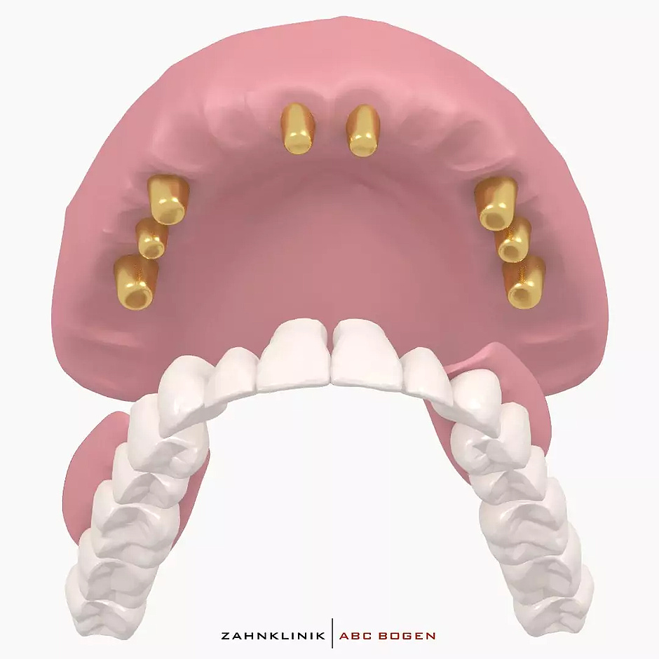 Hierfür werden die gesunden natürlichen Zähne mit Kronen verschlossen, auf welche wiederum herausnehmbare Verbindungselemente gesetzt werden. Dadurch hat der kombinierte Zahnersatz festen Halt und kann zur Reinigung selbstständig herausgenommen werden.