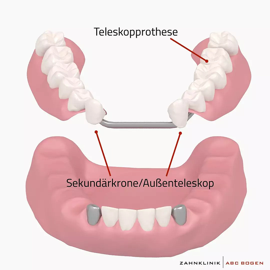 Über sogenannte Teleskopkronen werden beide Teile der Teleskopprothese miteinander verknüpft. Dauerhaft verankert wird dabei das sogenannte Innenteleskop (auch Primärkrone), während das Außenteleskop (die Sekundärkrone) in die Prothese eingesetzt wird. Diese stabile Verbindung der Innen- und Außenkrone sorgt für den zuverlässigen Halt der Teleskopprothese.