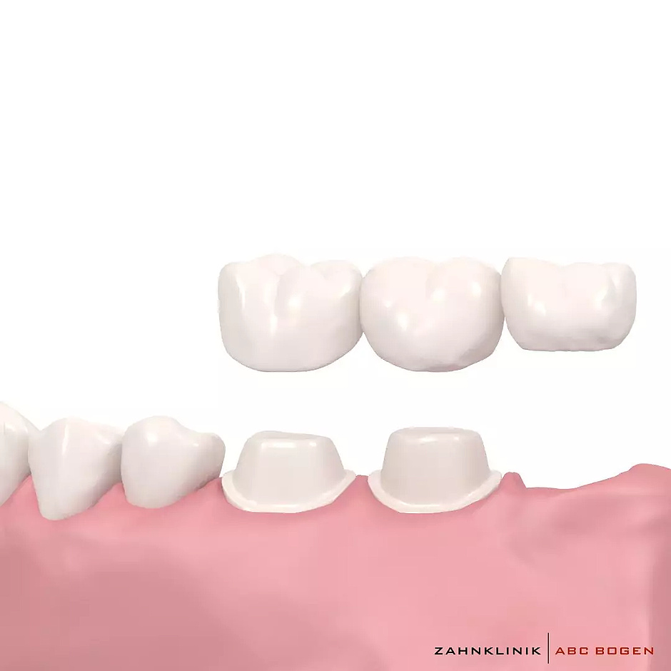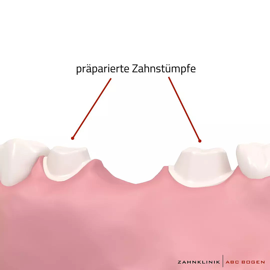 Mindestens zwei Nachbarzähne, die die Lücke umgeben, müssen zunächst präpariert werden. Hierfür werden sie beschliffen, das heißt Zahnsubstanz muss zur Aufnahme der Krone entfernt werden. Zum Schluss wird die Brücke sicher auf diesen sogenannten Brückenpfeilerzähnen mit einem speziellen Zement befestigt.