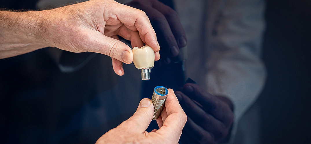 An erster Stelle bei der Implantation steht die Präzision. Andernfalls könnte es nicht harmonisch mit dem umliegenden Kieferknochen verwachsen. Fest eingeheilt, bietet die künstliche Zahnwurzel festen Halt für den später darauf aufgesetzten Zahnersatz: einer Krone, Brücke oder einer Prothese.