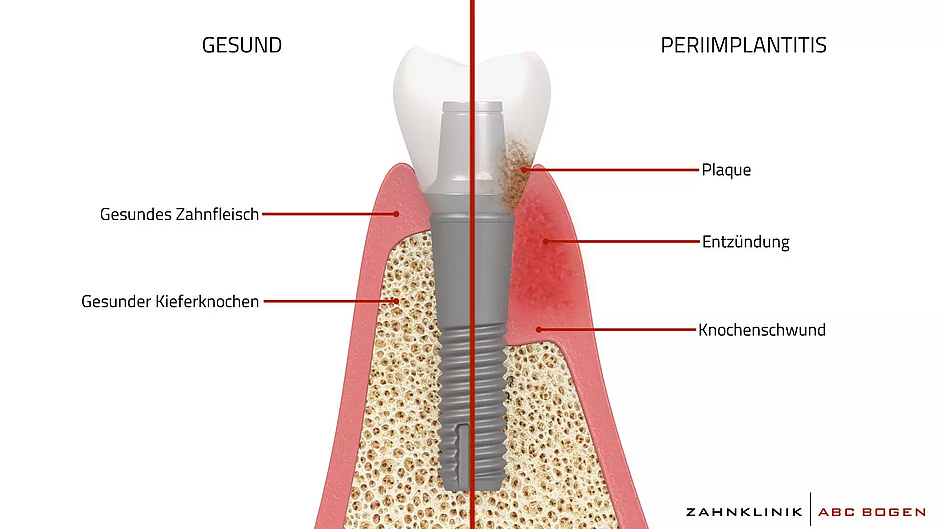 Dann kann es, zunächst in der Regel unbemerkt, zu einem Abbau der Knochensubstanz um das in den Kiefer eingewachsene Implantat kommen. Diese sogenannte Periimplantitis wird oft nur durch routinemäßig durchgeführte Röntgenkontrollen entdeckt, bisweilen erst lange nach der eigentlichen Implantation.