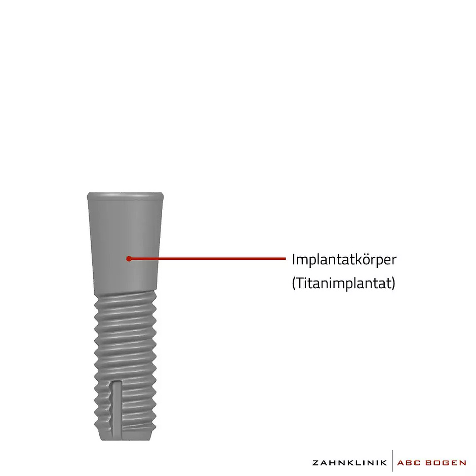 Durch ein Gewinde wird die oftmals zylindrisch geformte künstliche Zahnwurzel – der sogenannte Implantatkörper – unmittelbar im Kieferknochen verankert, wo er dauerhaft mit dem Knochen verwachsen soll. Dieser Implantatkörper stellt das Fundament für die im Anschluss an das Einheilen des Implantats im Kiefer aufgesetzte Implantatkrone dar.